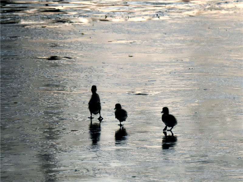 2019年12月2日,北京玉淵潭公園湖畔,三只野鴨寶寶在冰面上行走、湖中游弋,呆萌可愛(ài)。杜佳/視覺(jué)中國(guó) 編輯/陳進(jìn)
