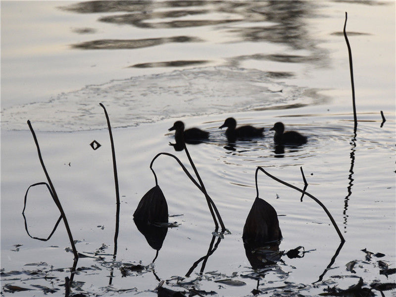 北京:玉淵潭野鴨寶寶“溜冰“戲水萌萌噠