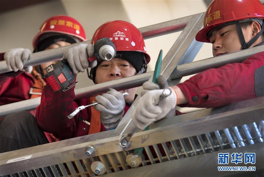 華山太華索道檢修人員在進(jìn)行走臺螺栓緊固(12月5日攝)。新華社記者陶明攝