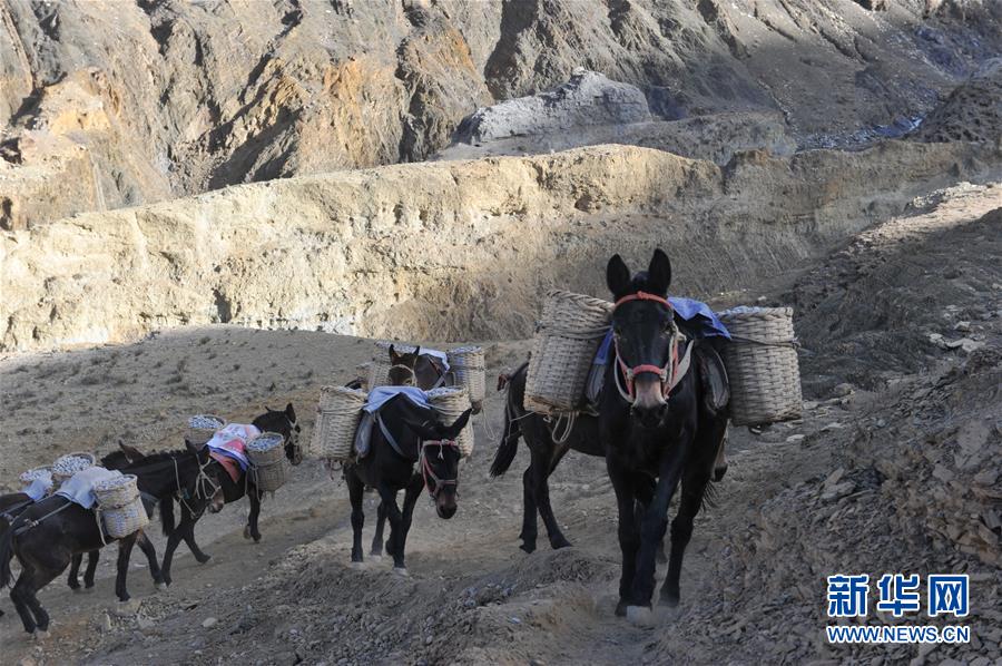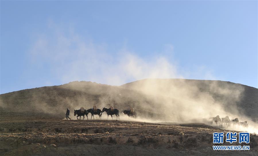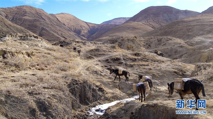 12月6日,騾馬隊(duì)馱負(fù)工程物料前往山頂塔基施工現(xiàn)場。新華社記者李楨宇攝