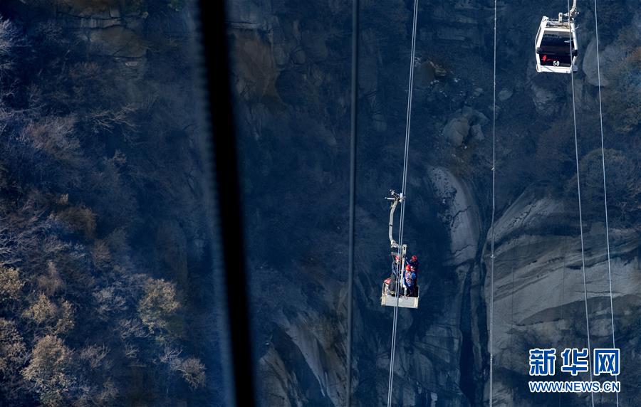 華山太華索道維修人員對索道支架及鋼絲繩進(jìn)行檢測(12月6日攝)。新華社記者陶明攝