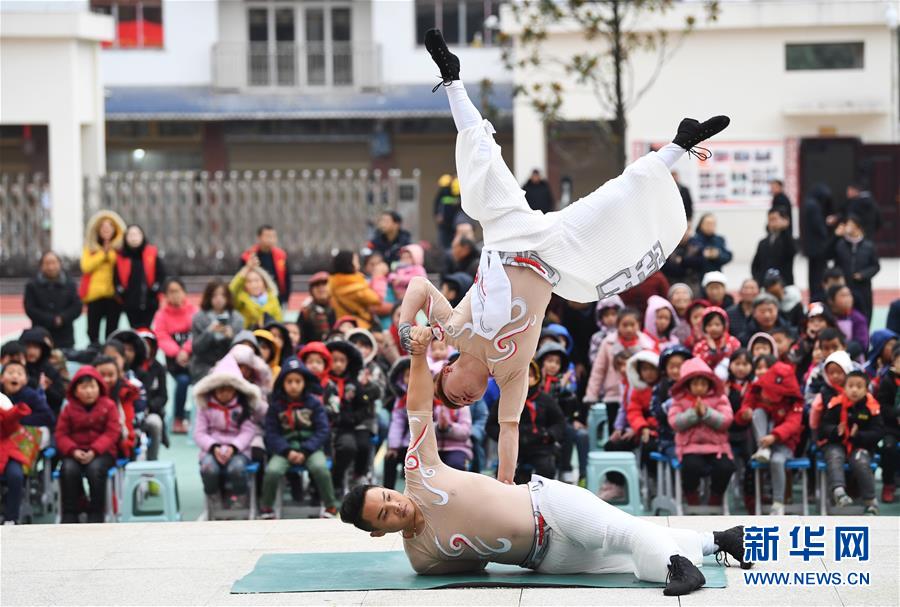 12月12日,文藝志愿者在中益鄉(xiāng)小學表演雜技《中國力量》。