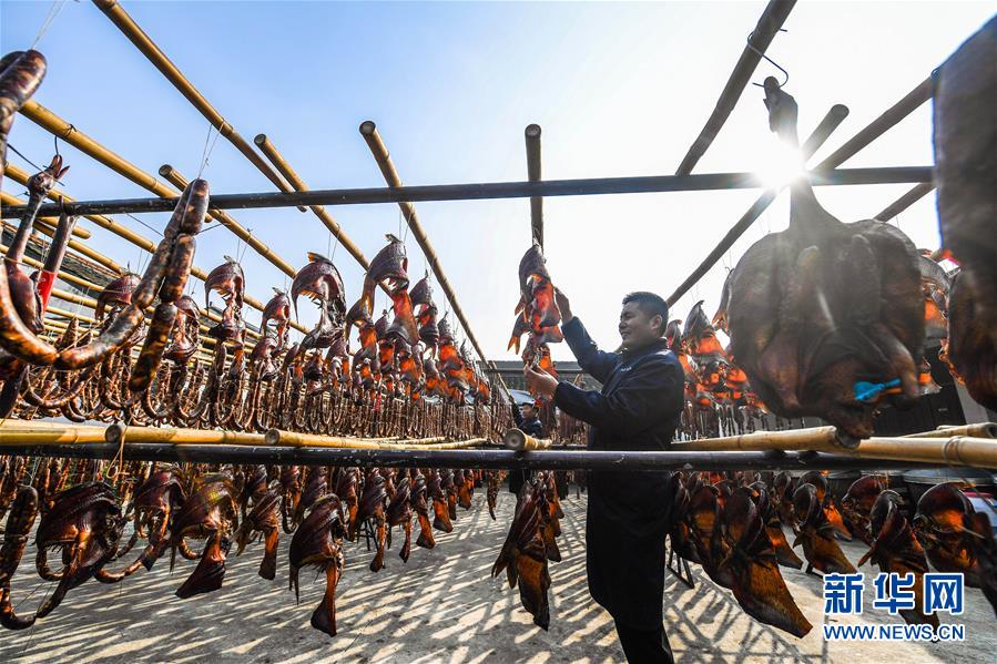 初冬時(shí)節(jié),浙江省紹興市柯橋區(qū)安昌古鎮(zhèn)開啟了傳統(tǒng)臘味制作、上市的季節(jié)。當(dāng)?shù)匕傩沼脗鹘y(tǒng)醬油、黃酒、香料等手工腌制臘腸、醬鴨、魚干、醬鵪鶉、醬排骨等紹興特色醬貨,在冬季的陽光下進(jìn)行晾曬,滿街飄香的臘味也成了這座江南古鎮(zhèn)的獨(dú)特風(fēng)景。安昌古鎮(zhèn)是浙江省歷史文化名鎮(zhèn),有著一千多年歷史,比較完善地保存了古吳越地區(qū)沿襲千百年來的民俗風(fēng)情。每年大雪節(jié)氣前后,安昌當(dāng)?shù)匕傩瞻凑諅鹘y(tǒng)習(xí)俗挑選晴朗好天氣制作、晾曬傳統(tǒng)醬貨,各類醬貨顏色黑紅油亮,咸鮮適口,是當(dāng)?shù)囟镜奶厣珎鹘y(tǒng)美食。新華社記者徐昱攝