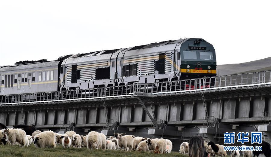 這是羊群和青藏鐵路上行駛的列車(6月10日攝)。新華社記者覺果攝