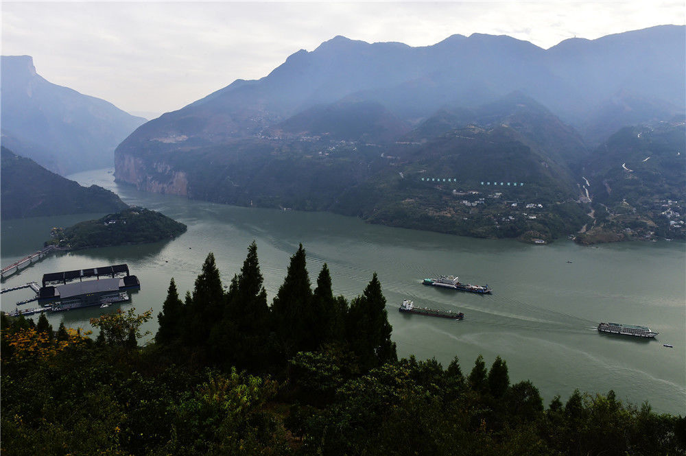 2019年11月2日,重慶,各種上行船舶正在通過白帝城前方的三峽夔門,蓄水后貨暢其流、往來無阻的水運(yùn)業(yè)彰顯“黃金水道”的社會(huì)效益。