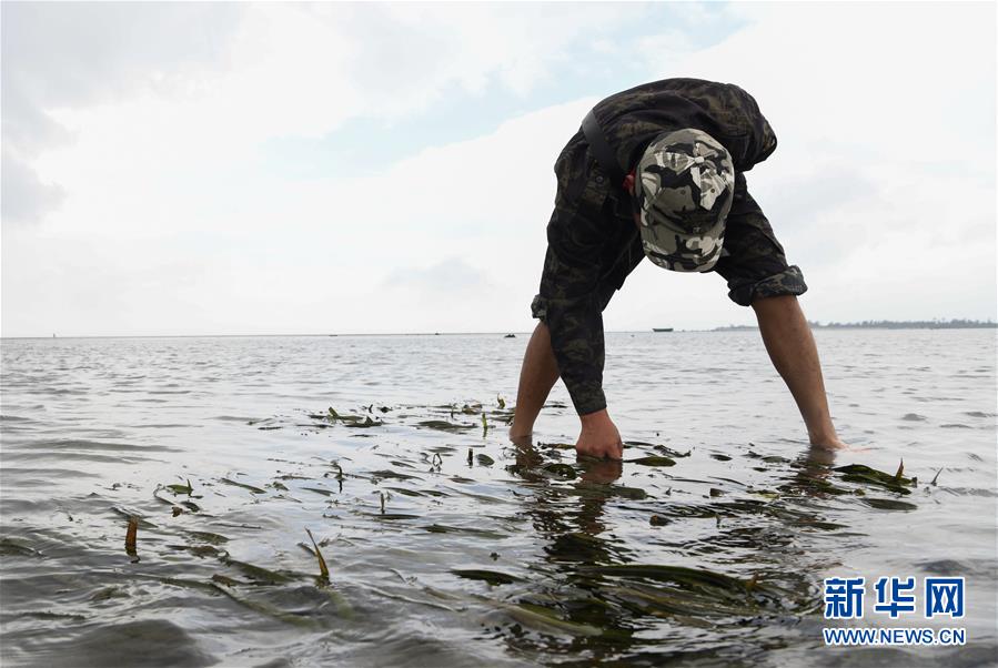 海南清瀾港省級自然保護區(qū)護林員呂詩陽在保護區(qū)內(nèi)的灘涂上查看海草情況(12月17日攝)。 新華社記者楊冠宇攝