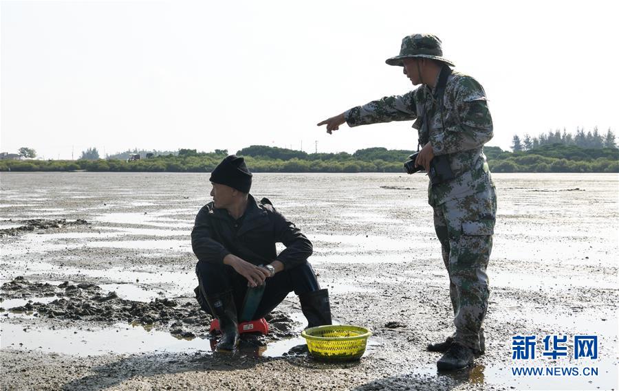 海南儋州新英灣紅樹林市級自然保護區(qū)護林員陳正平(右)在保護區(qū)內(nèi)的灘涂上向村民普及紅樹林濕地相關知識(12月10日攝)。陳正平2010年開始在保護區(qū)工作,他將工作發(fā)展成愛好,廣泛參加各種培訓和業(yè)內(nèi)交流。他在工作中拍到瀕危鳥類白肩雕出現(xiàn)在海南的照片,這刷新了海南省的鳥種記錄。新華社記者楊冠宇攝