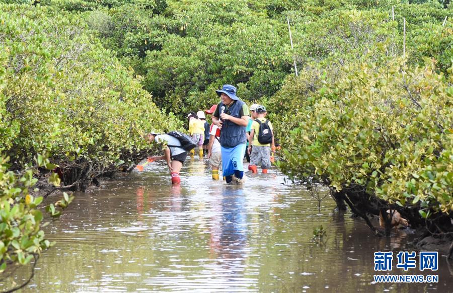 海南東寨港國家級自然保護區(qū)林業(yè)工程師馮爾輝(前)在保護區(qū)內(nèi)為學生進行講解(7月16日攝)。 馮爾輝2009年大學畢業(yè)后來到保護區(qū)工作,小時候他家就住在紅樹林邊上,他從小和紅樹林打交道,喜歡動植物和鳥類。外貿(mào)專業(yè)畢業(yè)的他邊工作邊學習,目前主要從事鳥類監(jiān)測、紅樹林保育、自然教育等工作?!凹t樹林看著我長大”,馮爾輝說,濕地保護的工作非常有意義。 新華社發(fā)