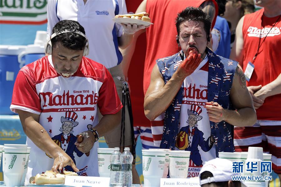 2019年7月4日,在美國(guó)紐約康尼島,選手參加一年一度的吃熱狗大賽。 新華社記者 李木子 攝
