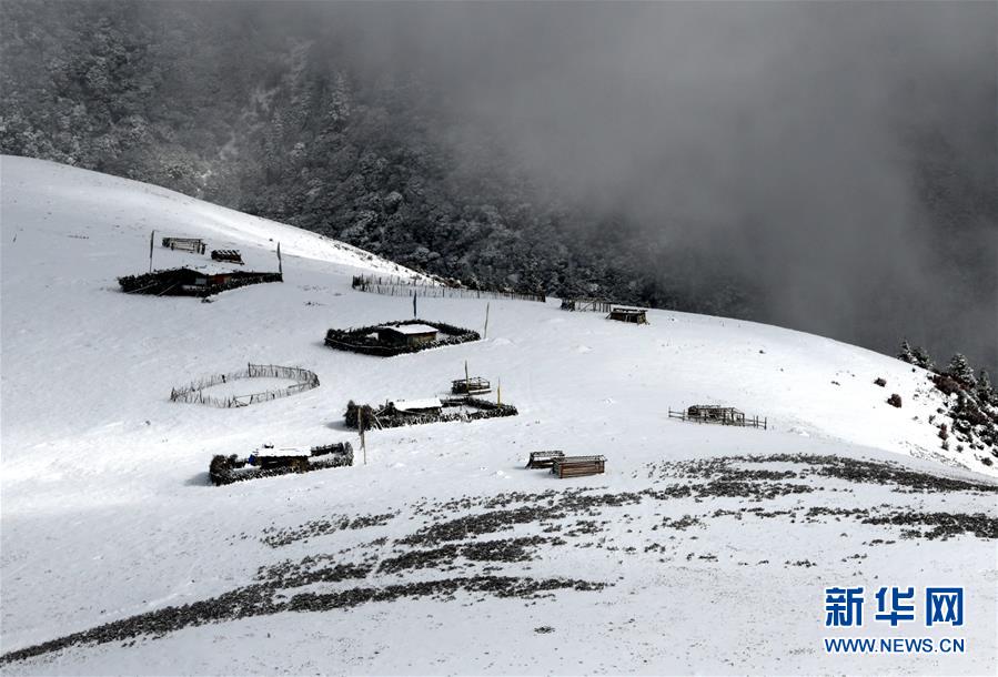 這是318國道剪子彎山段,大雪過后銀裝素裹(10月17日無人機拍攝)。新華社記者江宏景攝