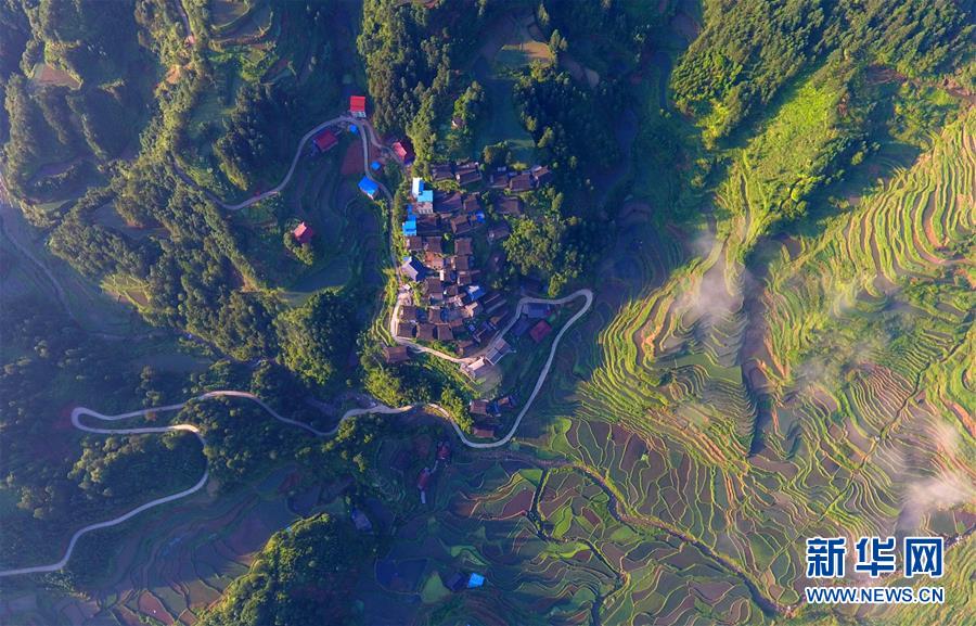 這是融水苗族自治縣桿洞鄉(xiāng)百秀村孔門苗寨的公路(6月14日無人機拍攝)。新華社記者黃孝邦攝