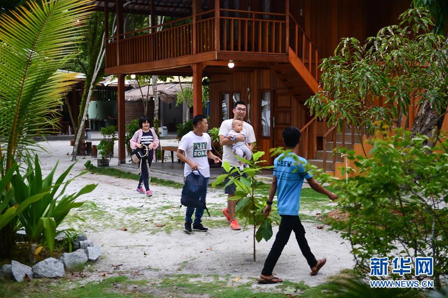 12月7日,在印度尼西亞邦加勿里洞省,李嘉文(左二)在李王島上幫助游客入住。新華社記者杜宇攝
