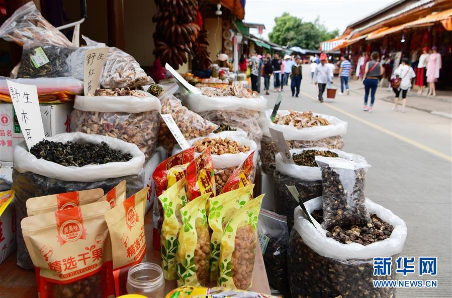 在龍巖市永定區(qū)湖坑鎮(zhèn)高頭鄉(xiāng)高北村的土樓風(fēng)情一條街,當(dāng)?shù)卮迕癜炎约荷a(chǎn)的各式農(nóng)產(chǎn)品向參觀游客進(jìn)行銷售(5月4日攝)。新華社記者魏培全攝