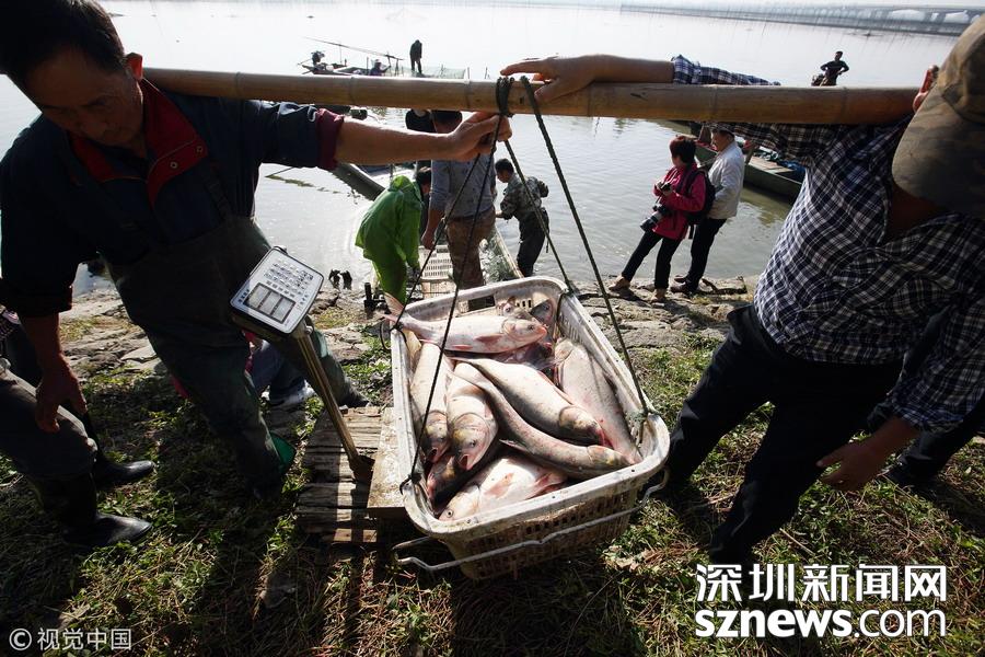 江蘇揚(yáng)州,漁夫?qū)Ⅳ~撈出過(guò)秤。