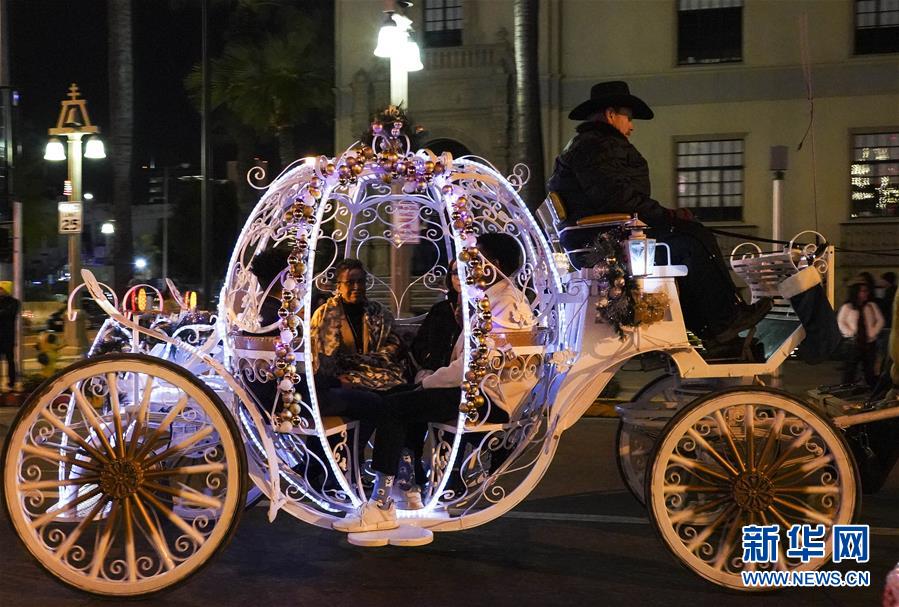 12月29日,人們?cè)诿绹永D醽喼堇锔ベ惖聼艄夤?jié)上乘坐馬車。 新華社記者李穎攝