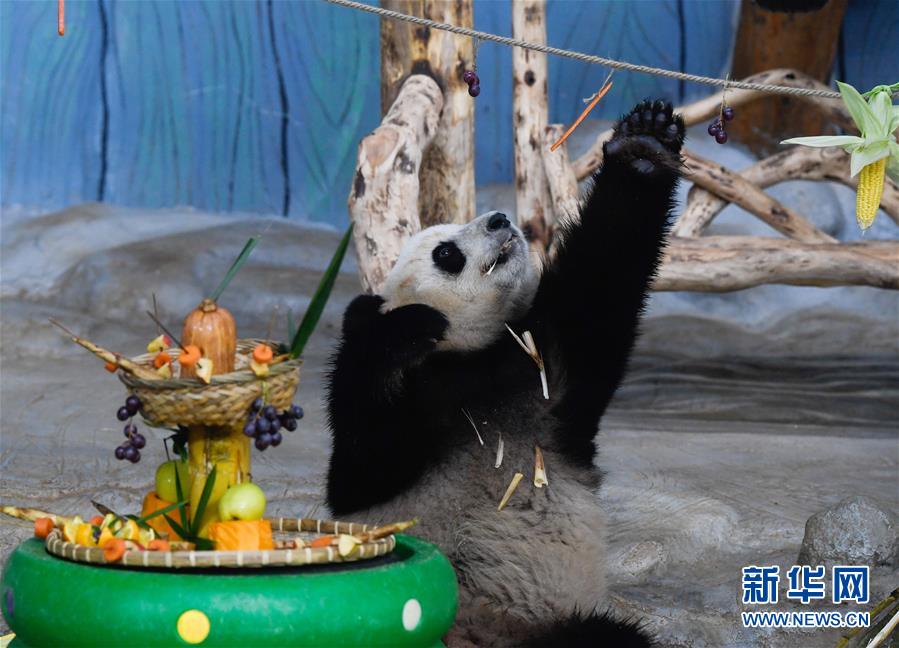 12月31日,大熊貓“貢貢”在摘取掛在高處的食物。 新華社記者 楊冠宇 攝