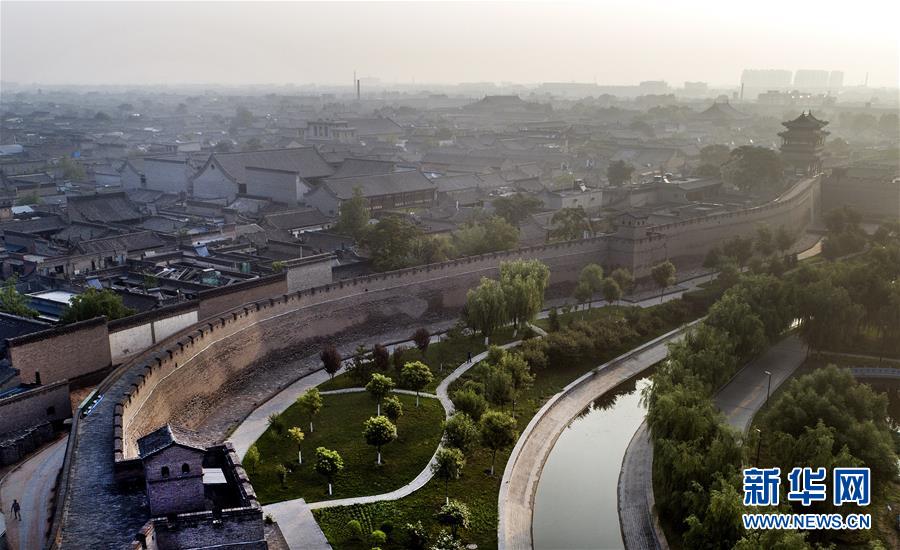 這是7月20日無人機(jī)拍攝的平遙古城墻與護(hù)城河。平遙古城城墻總周長6163米,墻高約12米,把面積約2.25平方公里的平遙縣城隔為兩個風(fēng)格迥異的世界。城墻以內(nèi)街道、鋪面、市樓保留明清形制,城墻以外為新城。