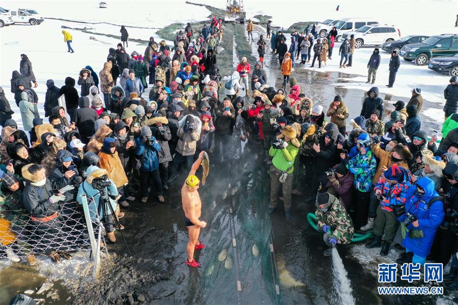 12月18日,一名冬泳愛(ài)好者展示冬捕魚(無(wú)人機(jī)拍攝)。新華社記者劉磊攝