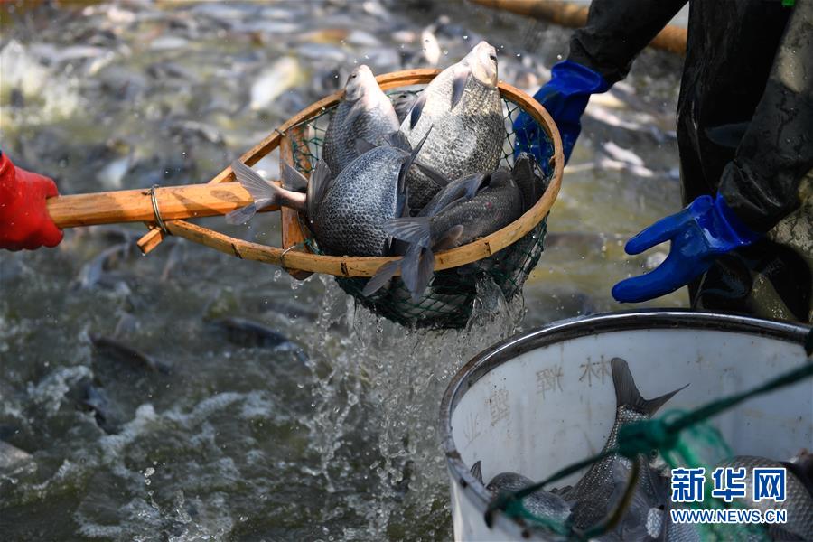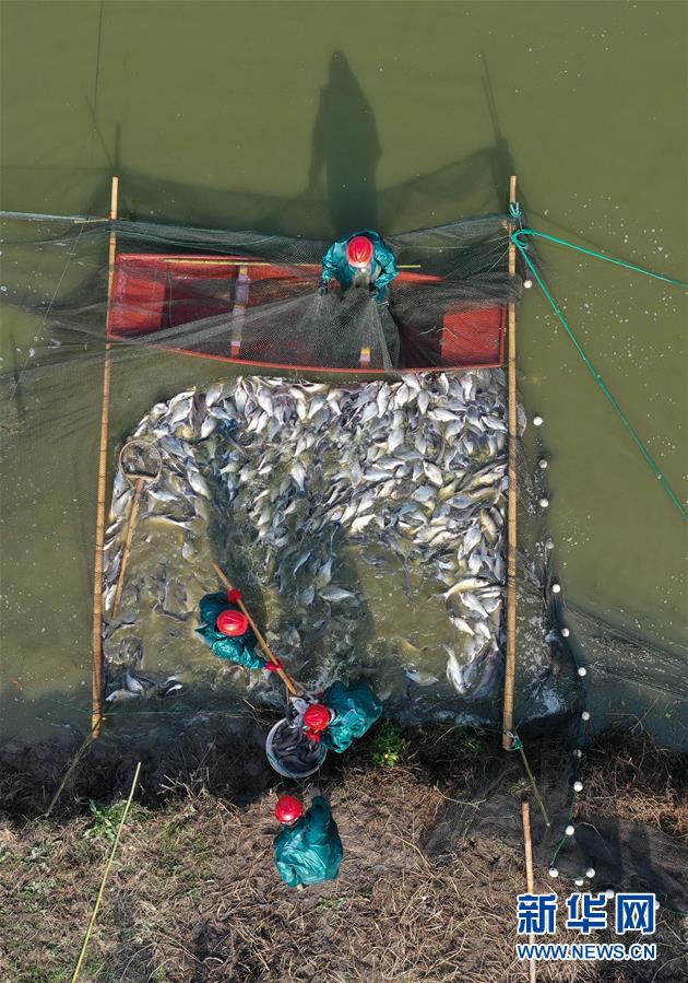 12月28日,漁民們?cè)诹夂?zhèn)盛江家庭農(nóng)場(chǎng)捕魚。新華社記者黃宗治攝