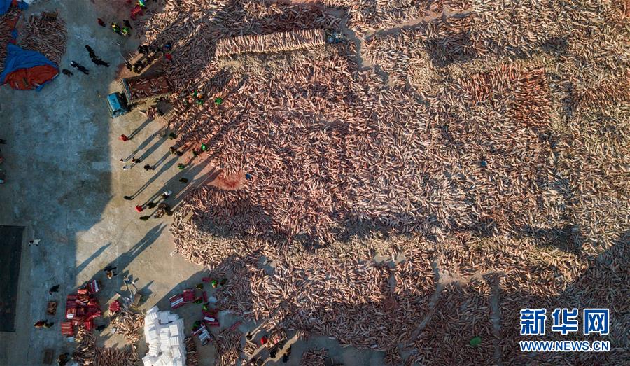 12月18日,工作人員將“頭魚”懸掛起來(lái),準(zhǔn)備售賣。新華社記者劉磊攝
