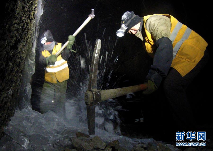 1月9日,在加格達(dá)奇工務(wù)段西羅奇嶺二號(hào)隧道,西羅奇維修工隊(duì)工作人員進(jìn)行隧道除冰作業(yè)。新華社記者王毓國(guó)攝