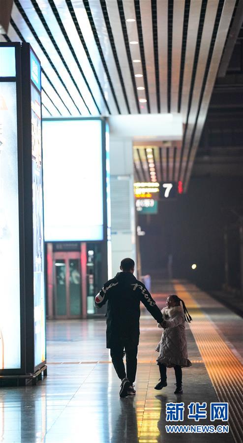 1月3日,朱梓芮(左)在站臺上和父親玩耍。即將見到母親,朱梓芮顯得格外興奮。新華社記者 胡晨歡 攝