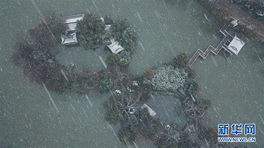 這是1月15日拍攝的合肥市包公園雪景(無人機(jī)照片)。 當(dāng)日,安徽省合肥市迎來降雪天氣。雪中的合肥市包公園景色別致。 新華社記者 張端 攝