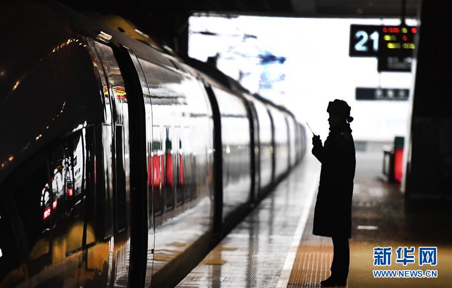 吉如在西安北站站臺上,與檢票口客運(yùn)人員聯(lián)控(1月14日攝)。今年春運(yùn)列車開行密度大,站臺崗位人員緊張,吉如時常被調(diào)到站臺進(jìn)行站臺服務(wù)工作。新華社記者陶明攝