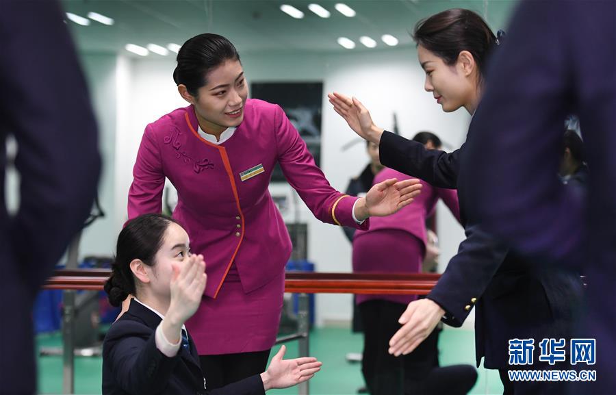 吉如(后左一)在車站職工活動室指導(dǎo)同事禮儀訓(xùn)練(1月15日攝)。新華社記者陶明攝
