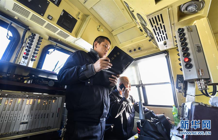 機(jī)車司機(jī)杜洪峰(右)與副司機(jī)謝振國進(jìn)行開車前的例行檢查(1月17日攝)。新華社記者許暢攝