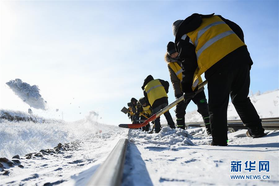 1月13日,白音庫倫綜合維修車間職工在作業(yè)點(diǎn)清理積雪。新華社記者劉磊攝