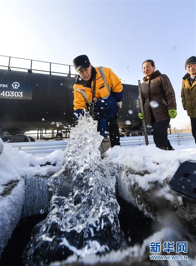 因?yàn)槎緶囟冗^低,送水員黃衛(wèi)東在蓄水前需要提前加熱閥門(1月17日攝)。新華社記者許暢攝