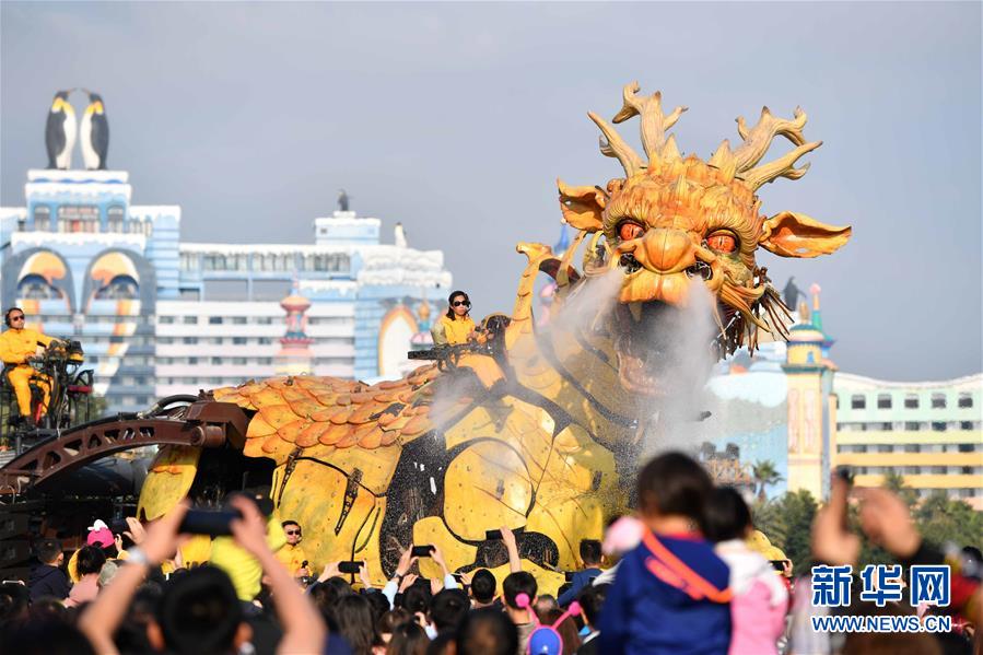 1月18日,大型機(jī)械裝置藝術(shù)品“龍馬精神”在珠海長隆海洋王國巡游展示。