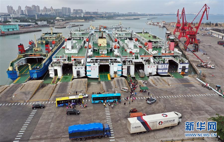 1月19日在??谛阌⒏圯喍纱a頭拍攝的在裝船的客滾輪(無人機照片)。 新華社記者 郭程 攝