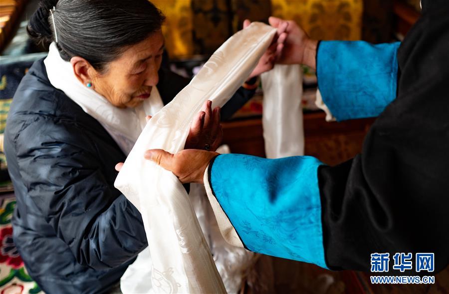一名藏族群眾給長輩敬獻(xiàn)哈達(dá),祝福長壽(2月24日攝)。 新華社記者 普布扎西 攝