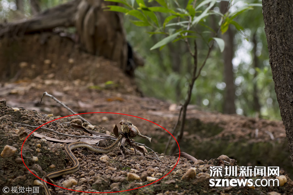 印度加爾各答B(yǎng)olpar,業(yè)余攝影師Agniswar Ghosal在Bolpar散步時拍到蛇大口吞咽蟾蜍的震撼場景。一條細(xì)長的蛇正試圖整個吞下一只大蟾蜍,蟾蜍的頭已經(jīng)進(jìn)了蛇口,大半截身體還在外邊。這條野心勃勃的蛇把這只毫無戒心的蟾蜍從洞里拖了出來,然后溜進(jìn)灌木叢,安靜地享用晚餐。