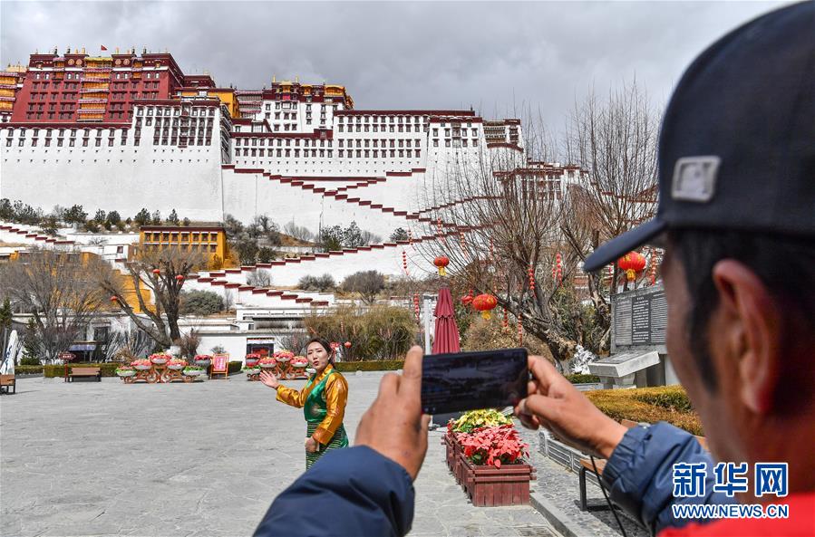 3月1日,布達(dá)拉宮管理處講解員次仁卓嘎(右)在進(jìn)行直播。新華社記者春拉攝