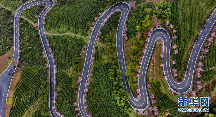 這是3月2日拍攝的平利縣長(zhǎng)安鎮(zhèn)洪福茶山,道路兩旁的春梅盛開(無人機(jī)照片)。新華社記者陶明攝