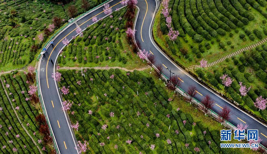 3月2日,游人在春雨中游覽平利縣長安鎮(zhèn)洪福茶山(無人機照片)。新華社記者陶明攝