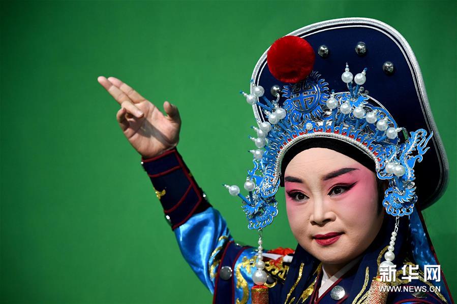 3月3日,李金玲在鄭州文化館通過(guò)直播的形式進(jìn)行帶妝表演豫劇《花木蘭》選段。新華社記者 李安 攝