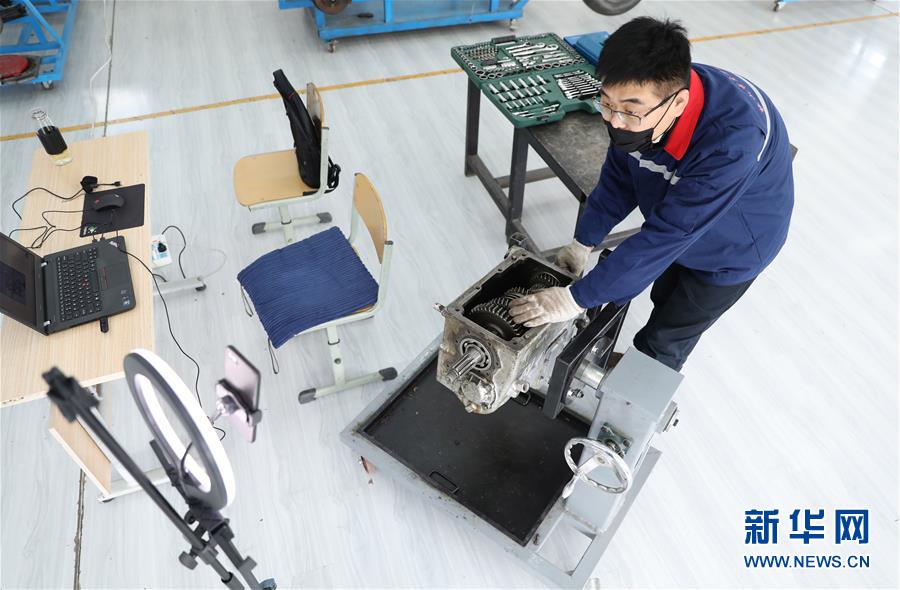 3月4日,職教城內(nèi)的鞍山市交通運輸學(xué)校的高峰老師為學(xué)生進行變速器檢修實訓(xùn)網(wǎng)絡(luò)授課。遼寧省鞍山市職教城內(nèi)的各類職業(yè)教育學(xué)校從3月2日恢復(fù)網(wǎng)絡(luò)授課以來,教師們設(shè)置了豐富多彩的課程,提高1萬余名學(xué)生線上學(xué)習(xí)的積極性。新華社記者姚劍鋒 攝