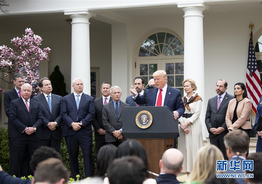 3月13日,美國總統(tǒng)特朗普(中)在華盛頓白宮的記者會(huì)上講話。特朗普當(dāng)天下午在白宮發(fā)表講話時(shí)正式宣布“國家緊急狀態(tài)”。他說,此舉旨在讓美國聯(lián)邦政府全力投入到抗擊新冠肺炎疫情的努力中。這項(xiàng)舉措將釋放500億美元資金,幫助各州和地方政府應(yīng)對疫情。新華社記者劉杰攝