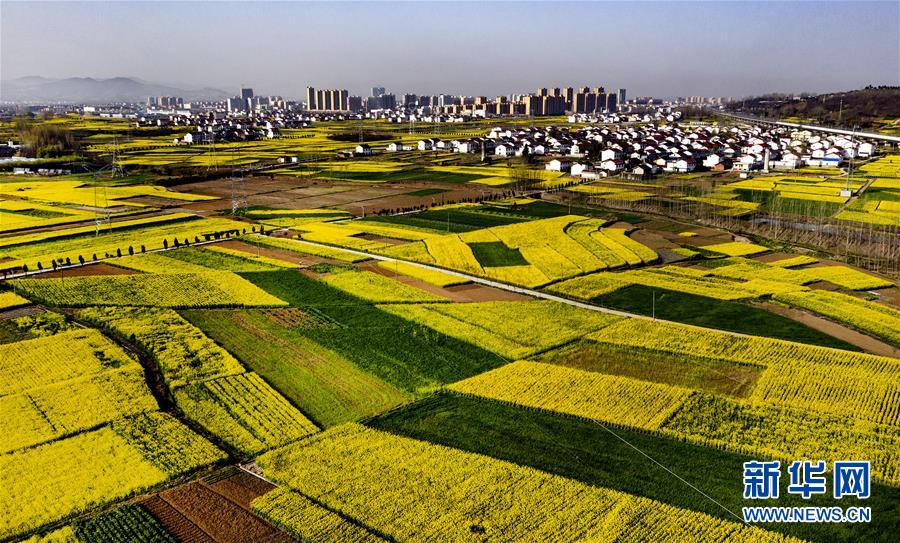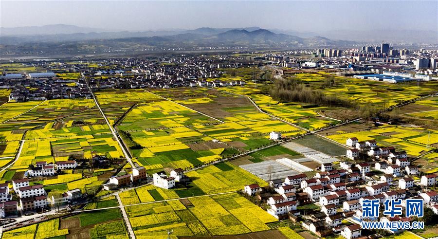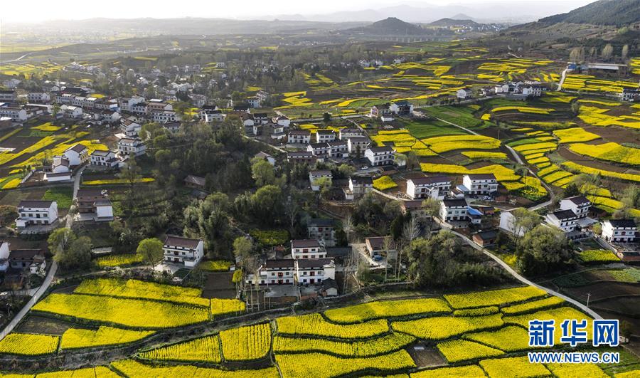 3月14日,洋縣龍亭鎮(zhèn)柳山村盛開的油菜花與村舍構(gòu)成美麗的圖畫(無(wú)人機(jī)照片)。 新華社記者陶明攝