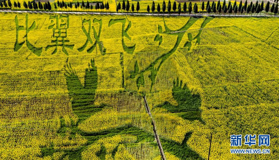3月14日拍攝的洋縣紙坊街道龍山觀花點(diǎn)創(chuàng)意種植的“相守一生”油菜花景觀(無(wú)人機(jī)照片)。 新華社記者陶明攝