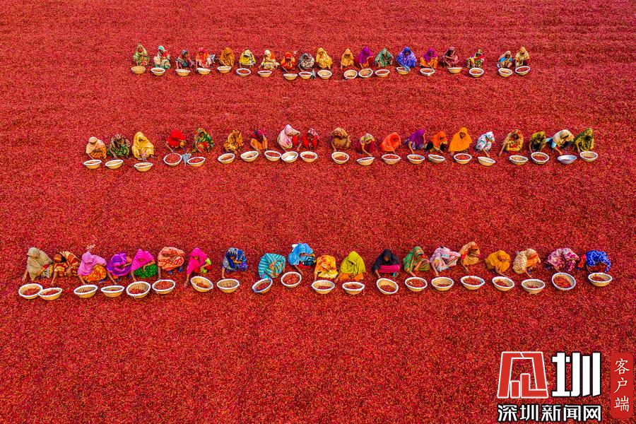 航拍孟加拉國工人分揀辣椒 滿眼火紅大地如鋪上地毯