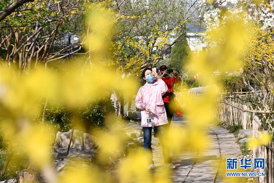 3月18日,游人在濟南百花公園拍照。新華社記者 朱崢 攝