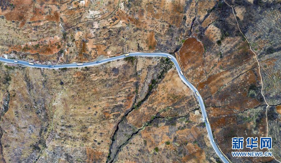搬家的車隊在開道警車的引領(lǐng)下從云南省永善縣大興鎮(zhèn)開往魯?shù)榭h卯家灣易地扶貧安置區(qū)(3月15日攝,無人機照片)。 新華社記者 江文耀 攝