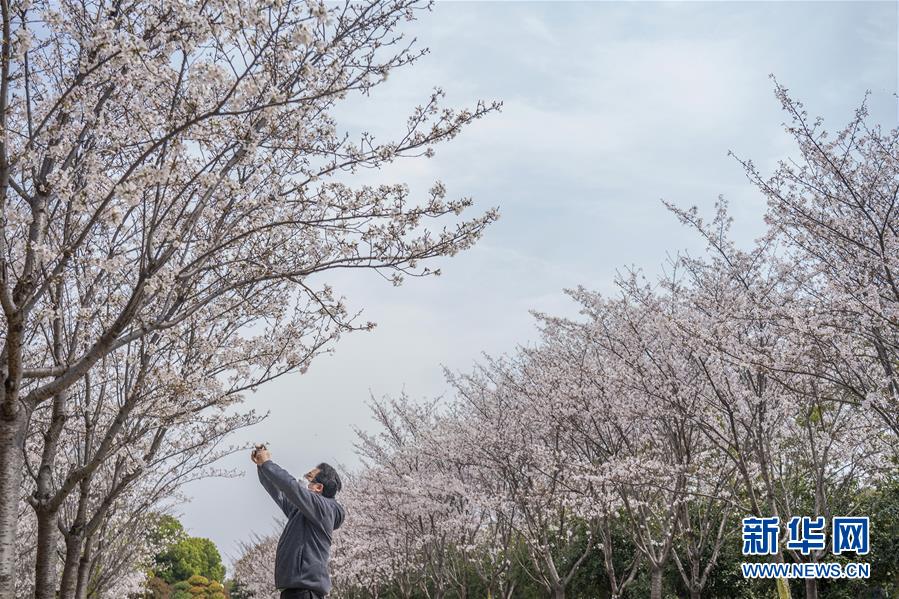 3月19日,在武漢市武昌區(qū)被網(wǎng)友稱為“武漢最美停車場”的湖北日報(bào)停車場,一名工作人員在拍攝櫻花。 新華社記者 才揚(yáng) 攝