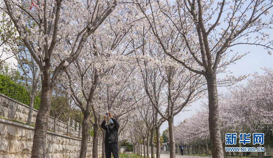 3月19日,在武漢市武昌區(qū)被網(wǎng)友稱為“武漢最美停車場(chǎng)”的湖北日?qǐng)?bào)停車場(chǎng),一名工作人員在拍攝櫻花。 新華社記者 才揚(yáng) 攝