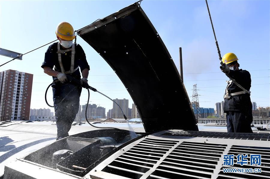 3月19日,鄭州車輛段客車檢車員在對客車空調(diào)機組蒸發(fā)器、壓縮機等內(nèi)部設(shè)備進(jìn)行清洗。新華社記者 李安 攝